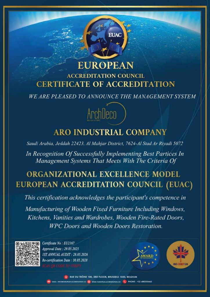 In recognition of successfully implementing best practices in management systems that meet the criteria of the Organizational Excellence Model in the manufacturing of wooden fixed furniture, including windows, kitchens, vanities, and wardrobes, wooden fire-rated doors, WPC doors, and wooden door restoration.